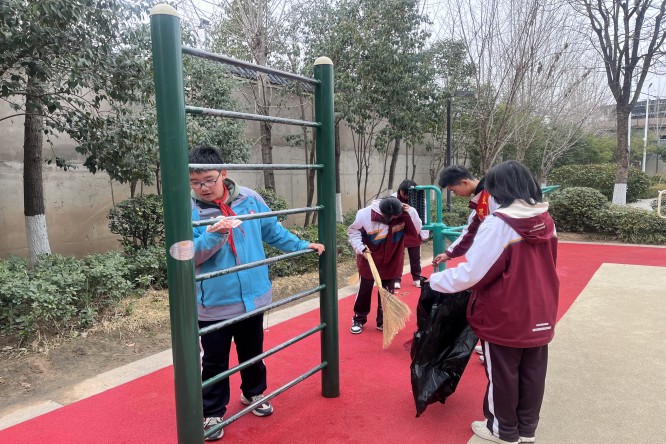 同时,在校园中,长庆二中师生以校园为阵地开展学雷锋志愿服务活动,积极投身 “美化校园环境 共建文明校园” 校园卫生死角清理行动。同学们在老师的带领下,分组对校园内的卫生死角进行全面清理,大家分工明确,有的负责清扫地面垃圾,有的负责清除操场排水沟垃圾,有的则负责捡拾花园中的垃圾。在活动过程中,志愿者们充分展现出不怕脏、不怕累的精神风貌,认真清理每一处卫生死角,不放过任何一个细节。他们用实际行动践行雷锋精神,为美化校园环境贡献自己的力量,让校园焕发出新的生机与活力。