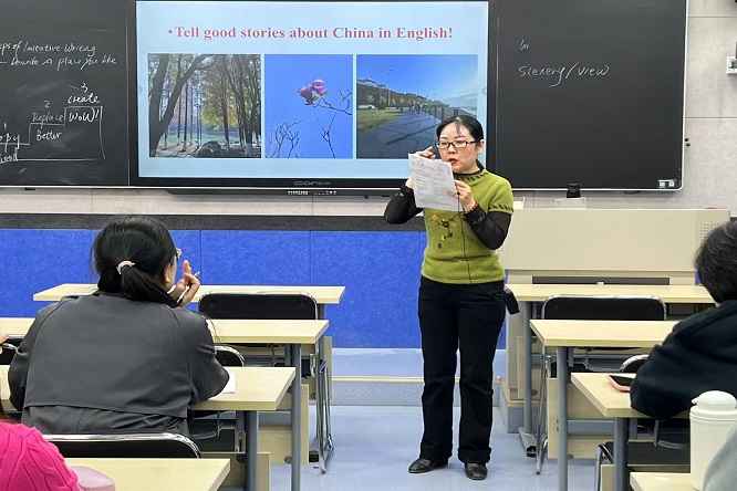 董老师的示范课构思精巧、设计新颖,持续刷新着教师们对课堂教学的认知边界。从阅读教学到语法教学,再到写作指导,从生活实践到课堂生成,董老师以开阔的国际视野和深厚的家国情怀,将教育智慧化作春风化雨般的育人力量,悄然浸润着学生的心灵,将学科核心素养的培养真正落实在课堂教学中。